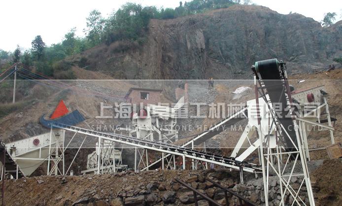 下圖為我公司為四川一客戶配置的石料生產(chǎn)線設(shè)備,主要由振動(dòng)給料機(jī)、顎式制砂機(jī)、反擊式制砂機(jī)、圓振動(dòng)篩及皮帶輸送機(jī)等設(shè)備組成。首先,大塊石料經(jīng)料倉(cāng)由振動(dòng)給料機(jī)均勻地送進(jìn)鄂式破碎機(jī)進(jìn)行粗碎,粗碎后的石料由皮帶輸送機(jī)送到反擊式破碎機(jī)進(jìn)行進(jìn)一步破碎;細(xì)碎后的石料由皮帶輸送機(jī)送進(jìn)振動(dòng)篩進(jìn)行篩分,篩分出幾種不同規(guī)格的石子,滿足粒度要求的石子由成品膠帶輸送機(jī)送往成品料堆;不滿足粒度要求的石子由膠帶輸送機(jī)返料送到反擊式破碎機(jī)進(jìn)行再次破碎,形成閉路多次循環(huán)。成品粒度可按照用戶的需求進(jìn)行組合和分級(jí),為保護(hù)環(huán)境,可配備輔助的除塵設(shè)備。